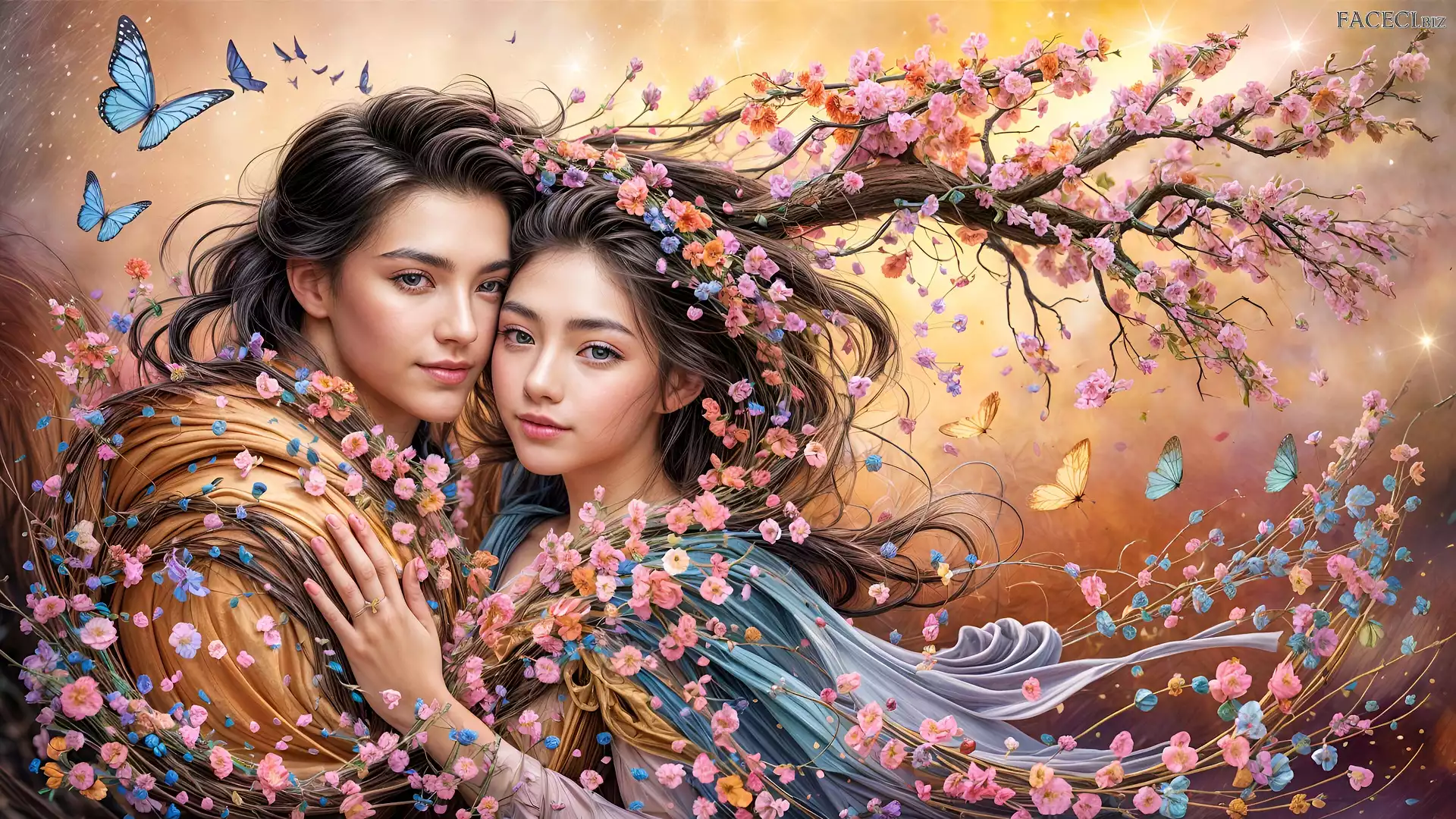 Grafika, Motyle, Kobieta, Mężczyzna, Kwiaty, Gałąź - faceci.biz
